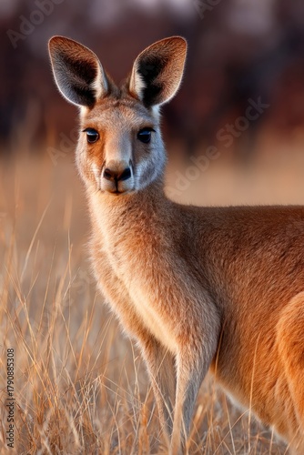 Fototapeta premium Kangaroo stands gracefully in golden grass under a beautiful sunset sky