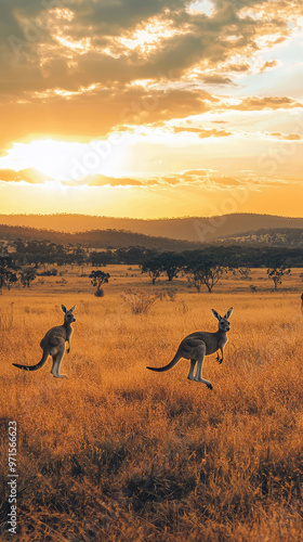 Fototapeta premium Kangaroos hopping across Australian outback at sunset, showcasing natures beauty