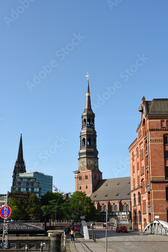 Naklejka premium Kannengießer-Brücke und St Katharinen Kirche in hamburger speicherstadt,...