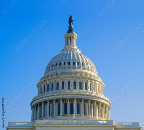 © MERCURY studio, Obraz premium Kapitol Stanów Zjednoczonych z flagami USA przy połowie personelu, budynek Kapitolu Narodowego Waszyngton, USA