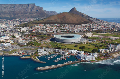 © Grant Duncan-Smith, Obraz premium Kapsztad, Prowincja Przylądkowa Zachodnia / RPA - 08/10/2011: Zdjęcie lotnicze portu w Kapsztadzie i nabrzeża Wiktorii i Alfreda z głową lwów w tle