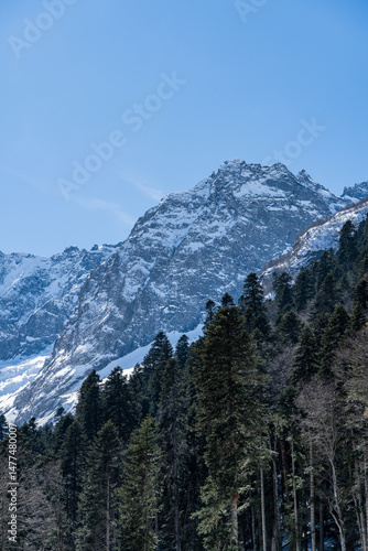 Fototapeta premium Karachay-Cherkessia. Dombay 2025. Majestic snow-capped mountain range towers above forested valley, showcasing nature's grandeur and serenity under clear blue sky. Nature concept for design.