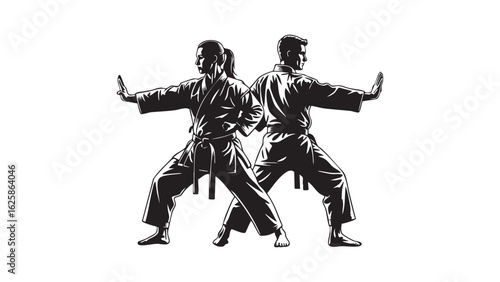 Obraz premium Karate Silhouette Mastery Man Woman in Striking Black White Motion Martial...