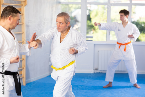 Obraz premium Karate sparring between men. Elderly athlete throwing punches