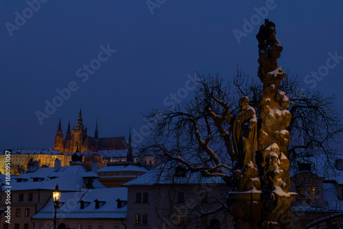 © Richard Semik, Fototapeta premium Karluv most statue viewing Prague Castle at winter night