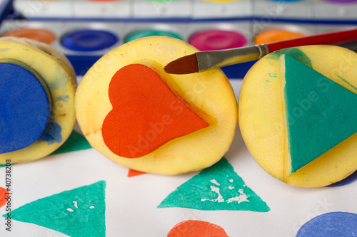 © okunsto, Naklejka premium Kartoffeldruck Stempel Bunt