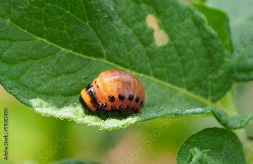© Pixelmixel, Fototapeta premium Kartoffelkäferlarve frisst Kartoffelblatt,