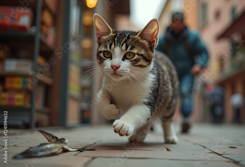Naklejka premium Katze auf der Jagd mit Fisch auf der Straße, Mensch im Hintergrund