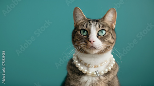 Obraz premium Katze mit Perlen Halskette vor einfarbigen Hintergrund isoliert Platz für...