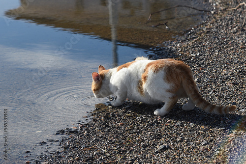 © R+R, Fototapeta premium Katze trinkt an Flussufer
