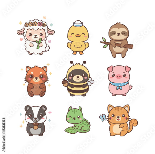 Fototapeta premium Kawaii Animal Sticker Set with Cute Panda, Cat, Sloth and Red Panda