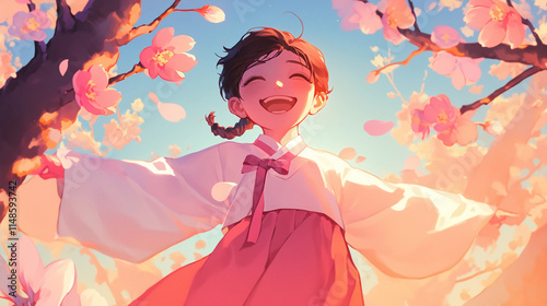 © rafliand, Fototapeta premium kawaii anime cartoon seollal korean new year celebration background