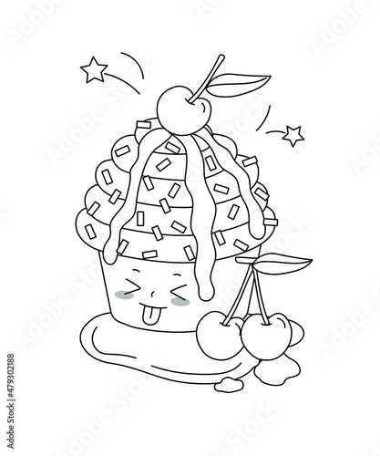 © Chunchunie, Naklejka premium Kawaii cherry cupcake illustration for kids coloring book