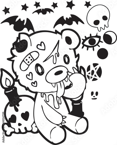 © SR CREATION, Fototapeta premium Kawaii coloring page jackalope baphomet bear and skull. Crystals. Magic, mysticism. Black and white illustration.