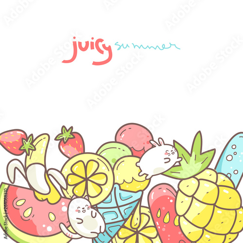 Naklejka premium Kawaii cute background with summer sweet food, ice-cream, fruits and funny...