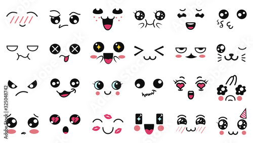 © Oleg, Naklejka premium Kawaii cute faces. Funny cartoon japanese emoticon in in different expressions. Expression anime character and emotion. Social network, print, Japanese style emoticons, Mobile, chat. kawaii emotions.
