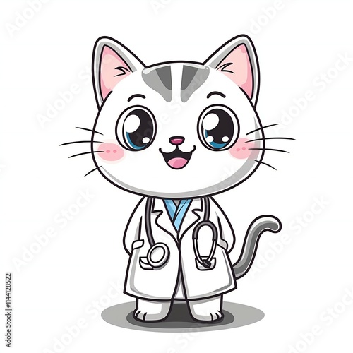 © Anisa, Obraz premium Kawaii 2D cartoon vector cat dressed as a doctor with a stethoscope, cheerful expression, simple design, white background.