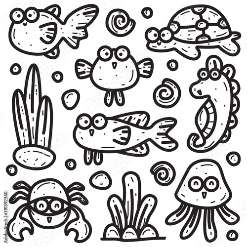 Naklejka premium kawaii doodle aquatic animals cartoon designs for coloring, backgrounds,...