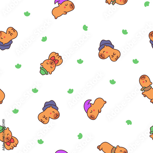 © palau83, Fototapeta premium Kawaii happy capybara. Seamless pattern. Cute cartoon funny animals character. Hand drawn style. Vector drawing. Design ornaments.