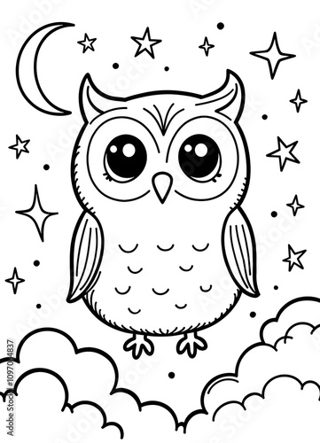 © mahfuzakhatun, Fototapeta premium Kawaii Owl in the Night Sky Coloring Page