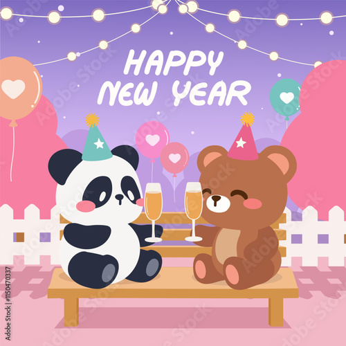 Fototapeta premium Kawaii Panda and Bear Celebrating New Year with Balloons and Lights. Happy...
