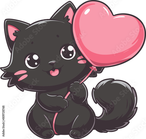 © Khai, Naklejka premium kawaii-style illustration of a cute, black cat holding a heart shaped balloon