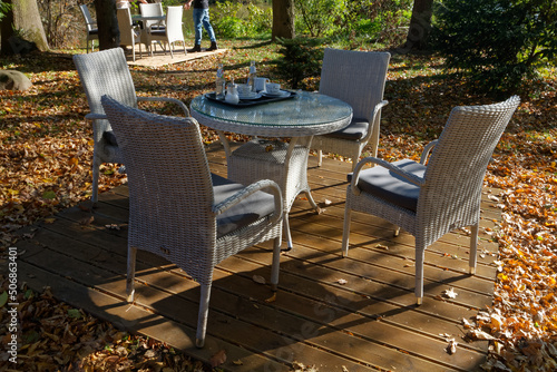 © Miroslaw, Naklejka premium Kawiarniany stolik z krzesłami w parku