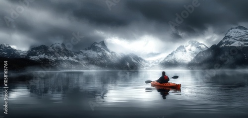 © AlgoCreative, Fototapeta premium Kayaker exploring calm waters with dramatic mountains in the background.