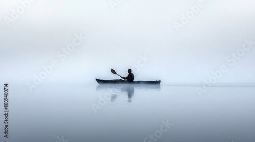 Fototapeta premium Kayaker navigating through fog serene lake nature tranquil environment...