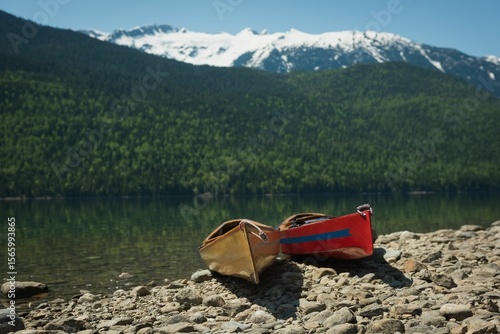 © vectorfusionart, Naklejka premium Kayaks by lake on sunny day