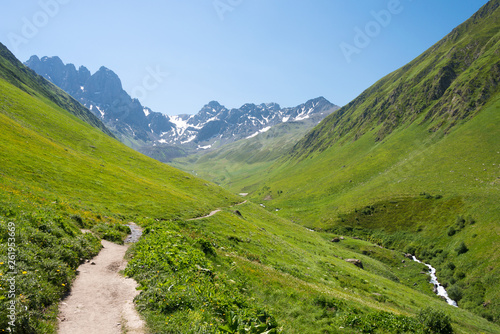 © beibaoke, Naklejka premium Kazbegi, Georgia - Jul 03 2018: Juta valley near Caucasus mountain. a famous landscape in Kazbegi, Mtskheta-Mtianeti, Georgia.