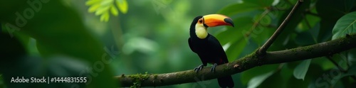 Naklejka premium Keel-billed toucan resting on thick branch, dense rainforest foliage, tree,...