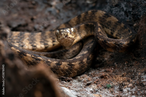 © DS light photography, Fototapeta premium Keeled slug snake on a tree stomp