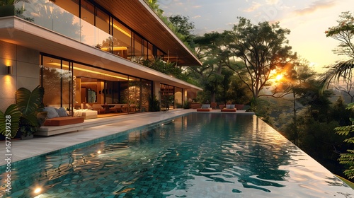 Obraz premium Kerala luxury villa design with sunset backdrop high resolution picture