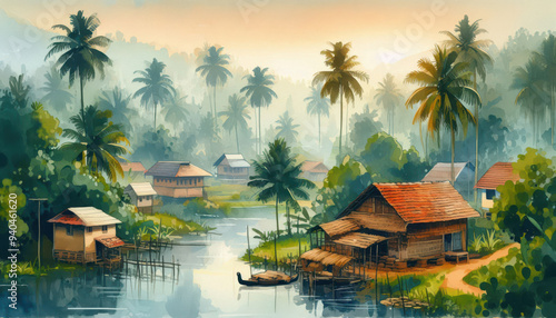 © PHOTO N LIFE, Fototapeta premium Kerala village landscape with mountains, coconut trees and small houses. Watercolor style Kerala village landscape. AI Generated