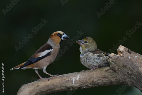 © Hawi, Fototapeta premium Kernbeißer-Männchen füttert Jungvogel