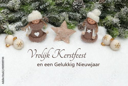 Obraz premium Kerstkaart: Nederlandse kerstgroeten met kerstversiering en dennentakken in...