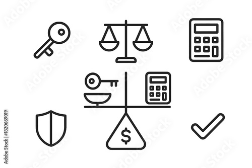 © Andrei, Obraz premium Key, calculator, shield, and checkmark symbols for financial security and balance
