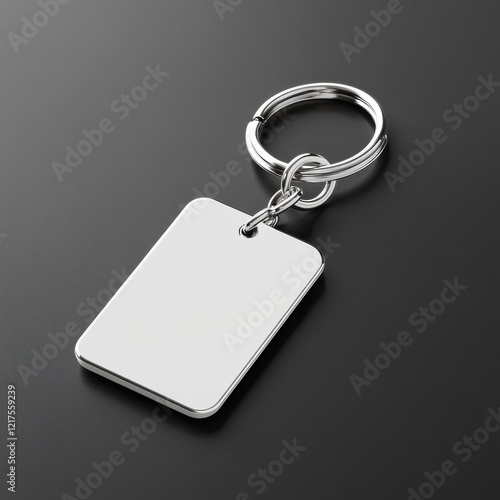 Fototapeta premium Keychain Mockup concept. A silver keychain with a blank rectangular tag on a dark surface, suitable for personalization or branding.