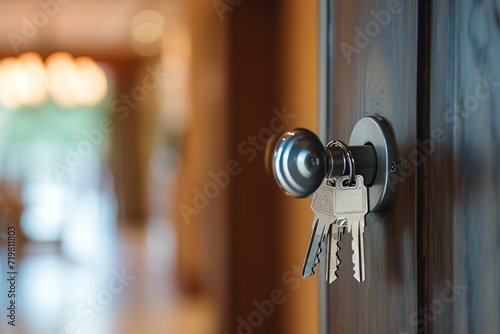Obraz premium Keys hanging in a door lock with home interior in the background