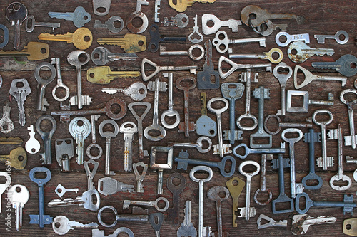 © kichigin19, Fototapeta premium Keys locks wooden background