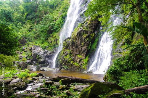 © Natalia Sidorova, Naklejka premium Khlong LAN, Tajlandia - sierpień 2016: Krajobraz dżungli z płynącą wodą wodospadu Khlong Lan w prowincji Kamphaeng Phet w głębokim tropikalnym lesie deszczowym. Park Narodowy Khlong Lan, Tajlandia