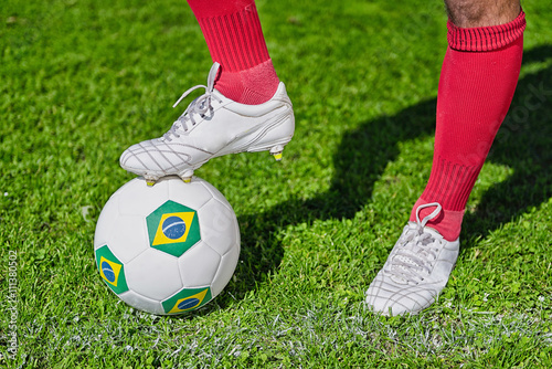 Fototapeta premium Kick off Brazil. Soccer player, foot on ball with Brazilian flags
