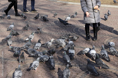 © Radila, Obraz premium Kid feeds pigeons in the park