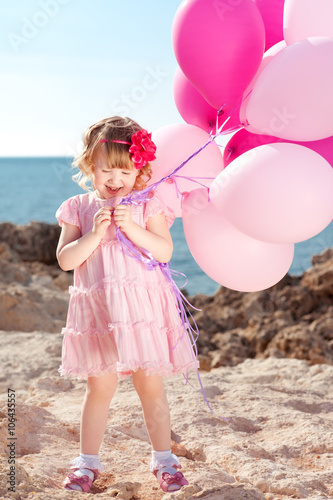 Fototapeta premium Kid girl 4-5 year old celebrating birthday. Holding balloons. Childhood.