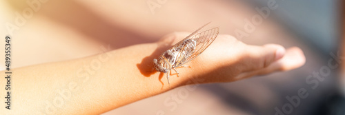 Obraz premium kid hand holding cicada cicadidae a black large flying chirping insect or bug or beetle on arm. child researcher exploring animals living in hot countries in Turkey. banner. flare