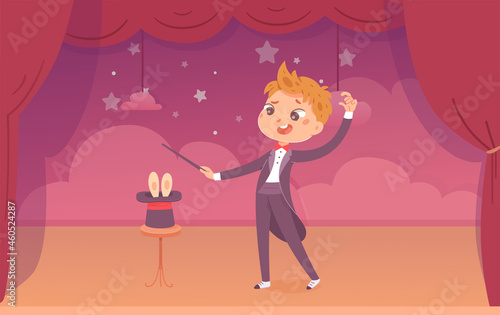 Obraz premium Kid magician and magic circus show, boy illusionist conjuring tricks with rabbit in hat
