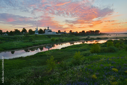 © longtaildog, Naklejka premium Kideksha village landscape. View to the Church of Boris and Gleb from the Nerl river bank. It is one of the oldest church in Russia, built in 1152.