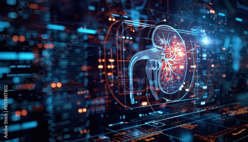 © ADEHERSTD, Fototapeta premium kidney testing results on digital interface on laboratory or surgical background, innovative technology in science and medicine concept. medical technology