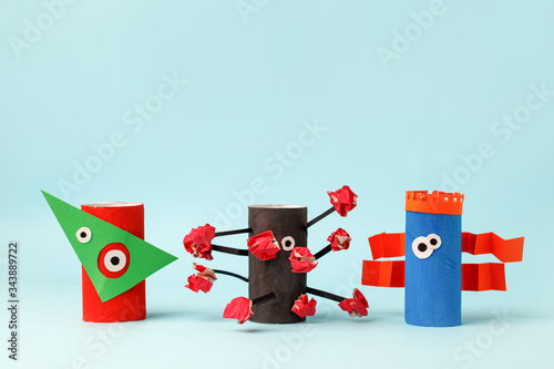 Fototapeta premium Kids art therapy, coronavirus pandemic. Halloween crafts, paper monsters on blue paper background with copy space for text. Concept handcraft, diy, creative idea from toilet tube, recycle